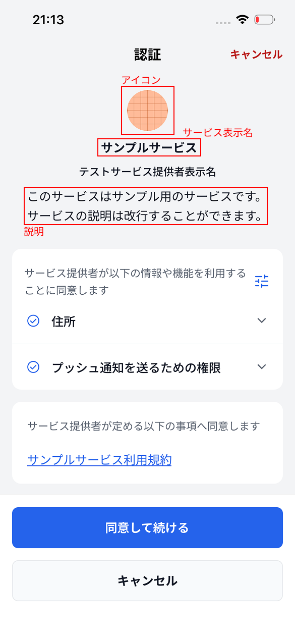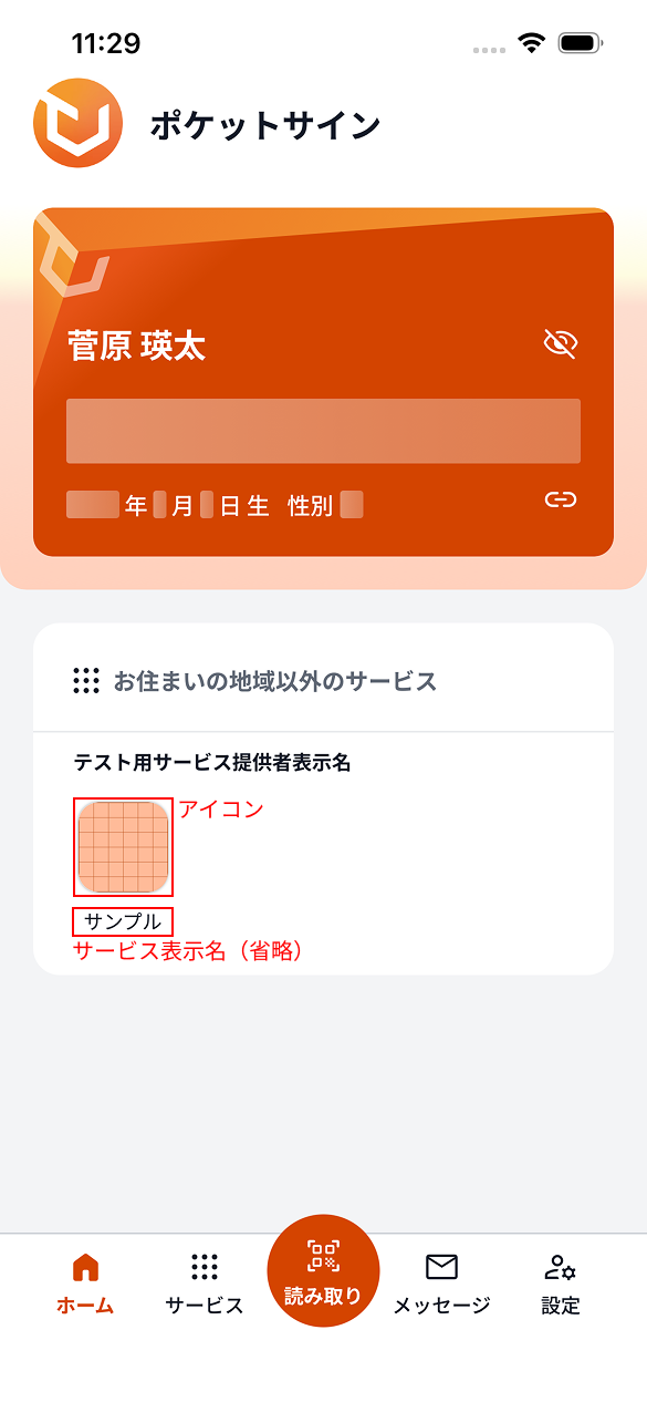 サービス情報で設定した情報は、ポケットサインアプリ上で以下のように表示されます。