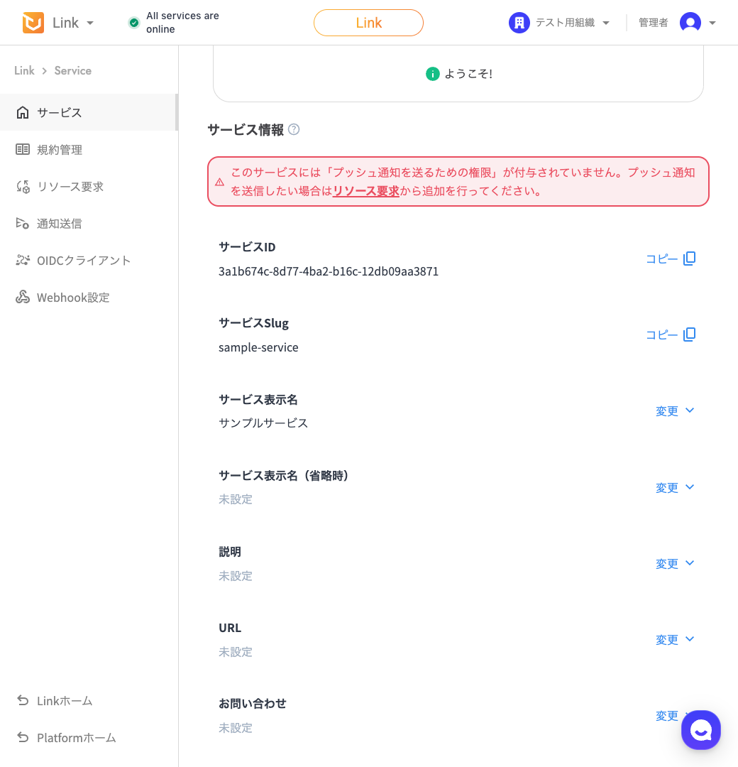初期状態では、サービスに対して「プッシュ通知を送るための権限」が付与されていない、という旨の警告が表示されますが、これは正常です。 リソース要求の手順に従って権限を設定すると、この警告は消えます。 プッシュ通知を送る必要がない場合は、この警告を無視しても問題ありません。