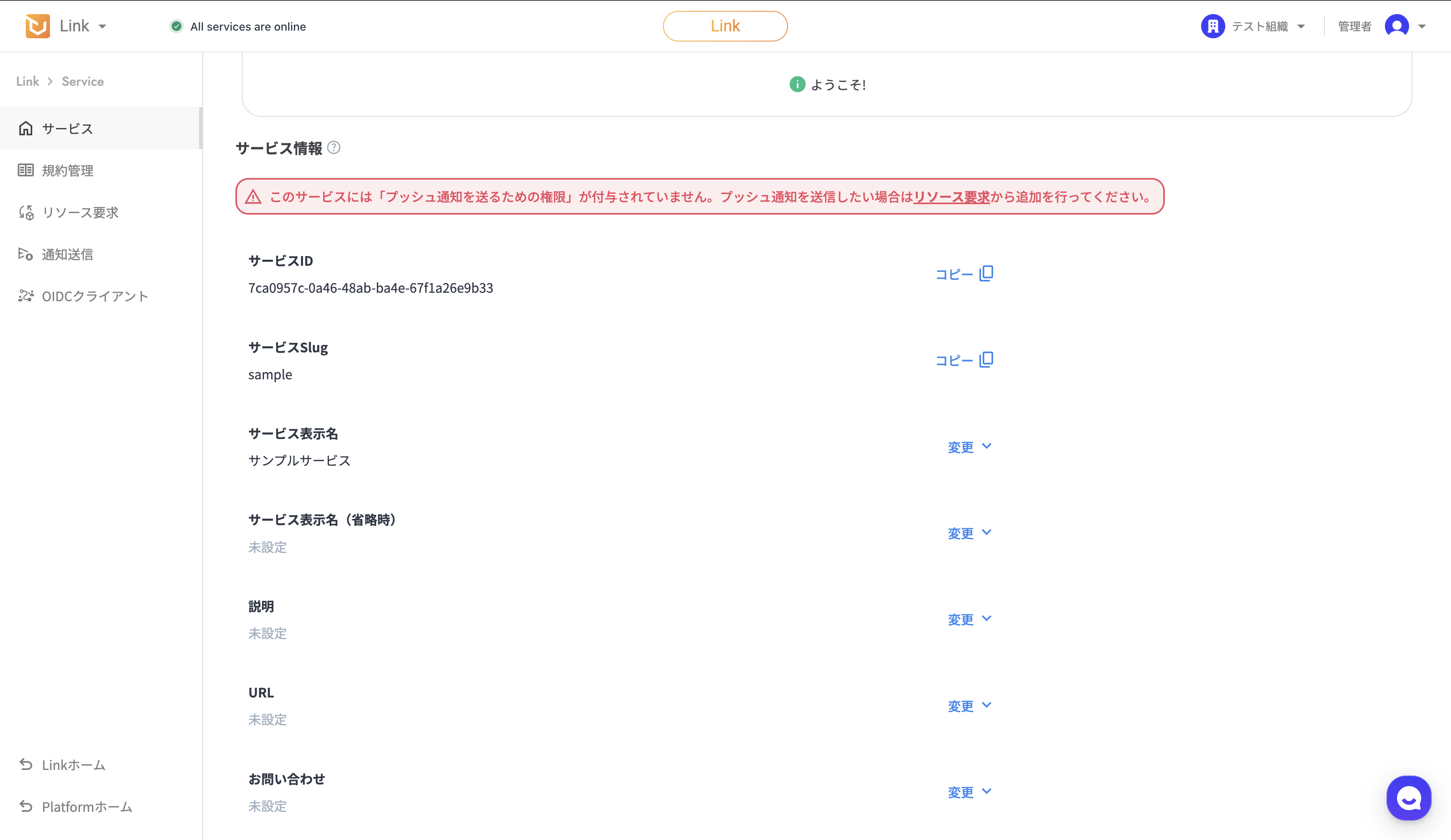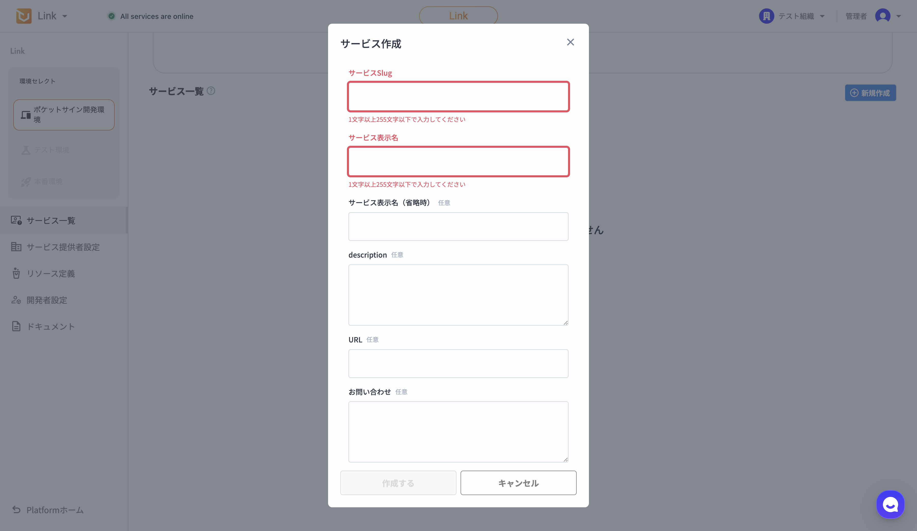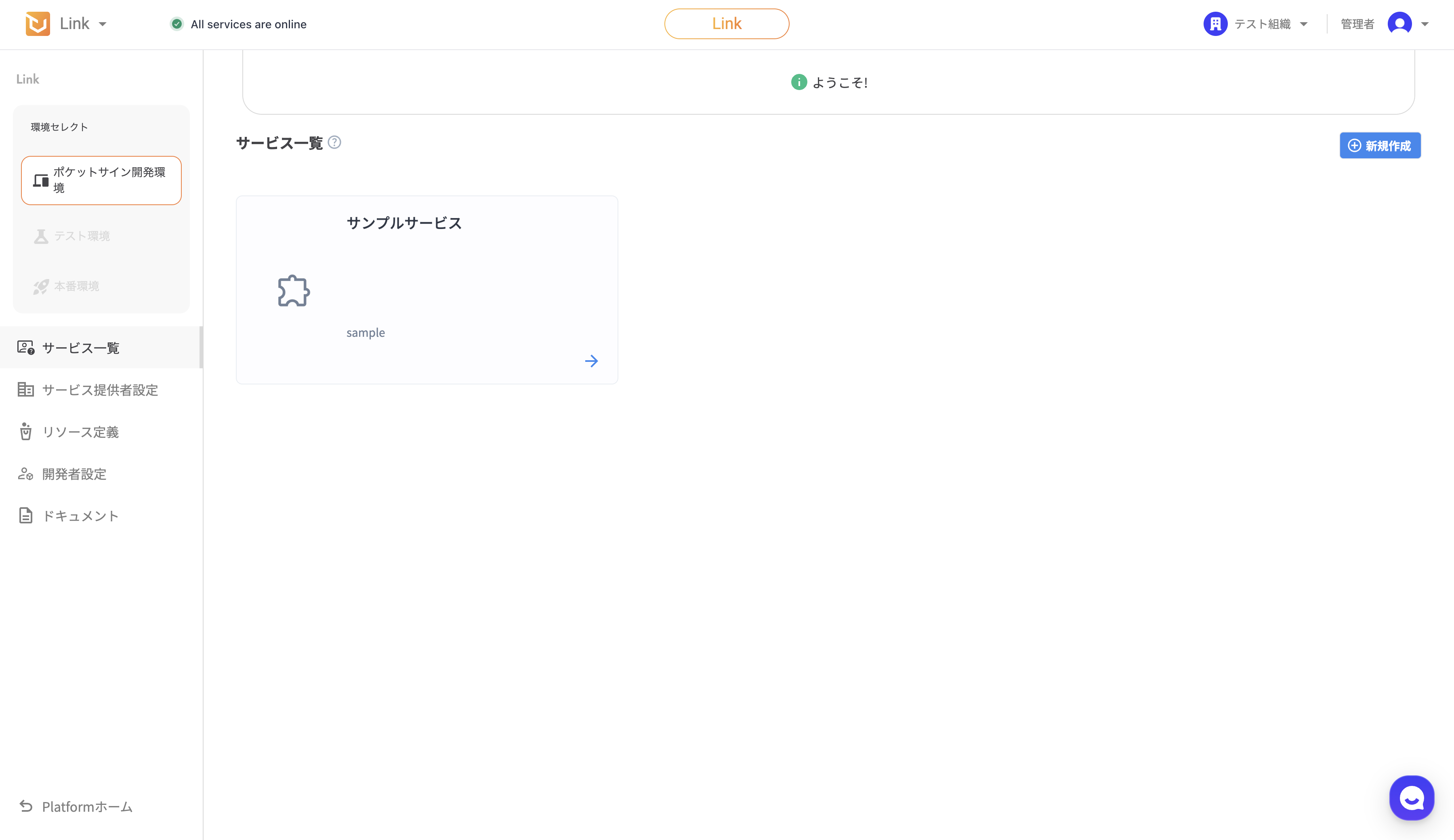 PocketSign Platform の Link 画面に移動し、サービスを作成します。 いずれもモック環境を使用します。